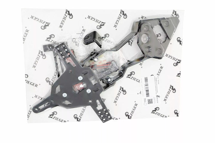 O suporte da placa é extremamente durável e à prova de intempéries., Pó preto revestido. , O titular da placa pode ser usado para qualquer tipo de placa (largura de 175 mm)., Nenhuma modificação da carenagem necessária., Ajuste de rolagem do ângulo de ancinho., Suporte ao indicador ajustável em 3 posições. Placa., Indicador Especial Montagens de luz (vendidas separadamente) necessárias para as luzes indicadoras de estoque., Kit inclui: 1 suporte da placa incl. Kit de montagem, luz da placa LED "E aprovado" incl. Suporte., Luz de volta com suporte.