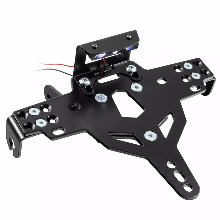 O suporte da placa é extremamente durável e à prova de intempéries., Pó preto revestido. , O titular da placa pode ser usado para qualquer tipo de placa (largura de 175 mm)., Nenhuma modificação da carenagem necessária., Ajuste de rolagem do ângulo de ancinho., Suporte ao indicador ajustável em 3 posições. Placa., Indicador Especial Montagens de luz (vendidas separadamente) necessárias para as luzes indicadoras de estoque., Kit inclui: 1 suporte da placa incl. Kit de montagem, luz da placa LED "E aprovado" incl. Suporte., Luz de volta com suporte.
