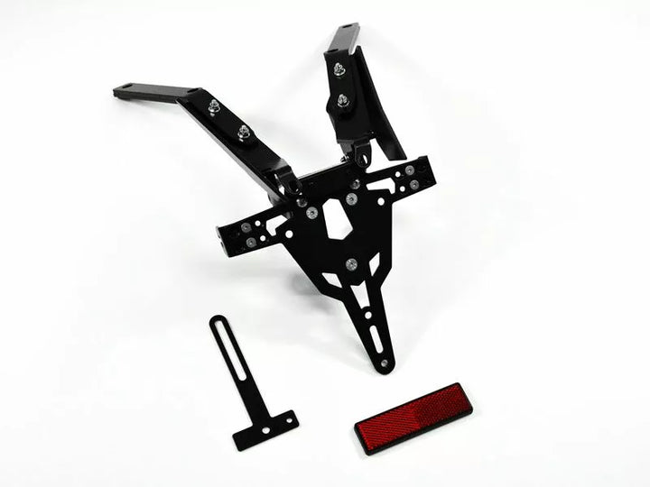 O suporte da placa é extremamente durável e à prova de intempéries., Pó preto revestido. , O titular da placa pode ser usado para qualquer tipo de placa (largura de 175 mm)., Nenhuma modificação da carenagem necessária., Ajuste de rolagem do ângulo de ancinho., Suporte ao indicador ajustável em 3 posições. Placa., Indicador Especial Montagens de luz (vendidas separadamente) necessárias para as luzes indicadoras de estoque., Kit inclui: 1 suporte da placa incl. Kit de montagem, luz da placa LED "E aprovado" incl. Suporte., Luz de volta com suporte.