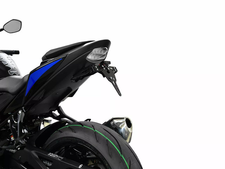 O suporte da placa é extremamente durável e à prova de intempéries., Pó preto revestido. , O titular da placa pode ser usado para qualquer tipo de placa (largura de 175 mm)., Nenhuma modificação da carenagem necessária., Ajuste de rolagem do ângulo de ancinho., Suporte ao indicador ajustável em 3 posições. Placa., Indicador Especial Montagens de luz (vendidas separadamente) necessárias para as luzes indicadoras de estoque., Kit inclui: 1 suporte da placa incl. Kit de montagem, luz da placa LED "E aprovado" incl. Suporte., Luz de volta com suporte.